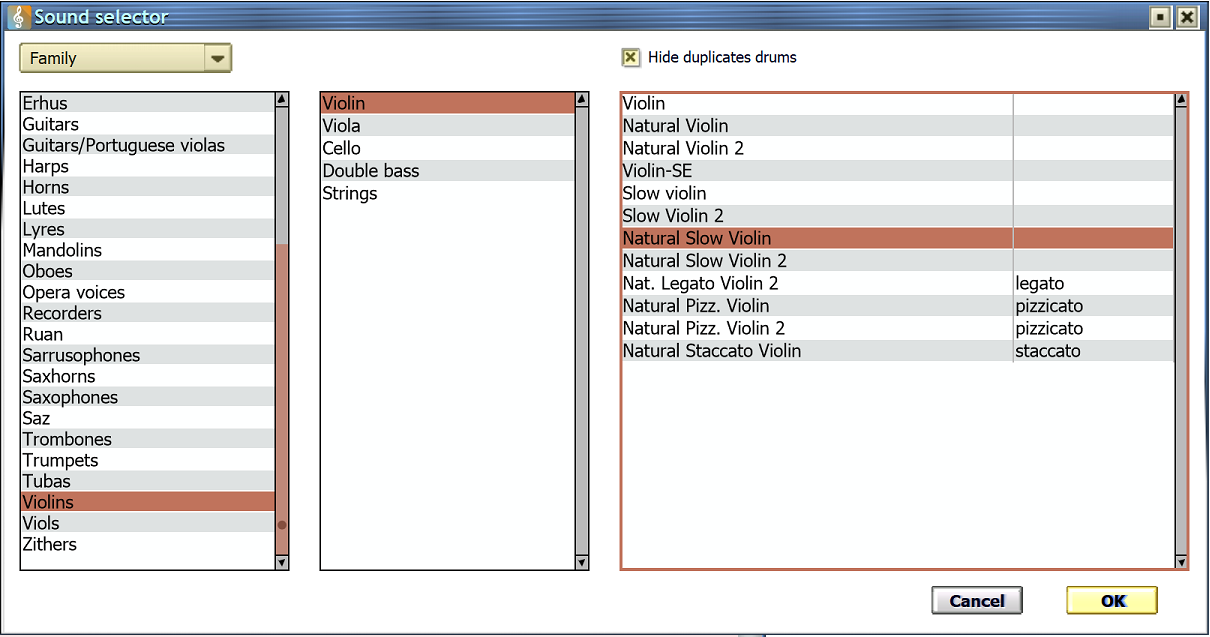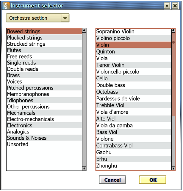 | MIDI sections are the way sounds (timbres) are grouped, and is more or less the left column in Edit Instrument dialog: pianos, chromatic percs, organs, guitars, bass, strings... with a lot of stupidities like harpsichord in "pianos". Extended MIDI and Gold put the Cimbalom into Chromatic percs because some say that drummers can learn easily to this instrument... not sure that's really the case !! And the Yangqin (chinese hammered dulcimer) is in the Strings. I made some little fixes, but the most important to me is the orchestra section : plucked, struck, bowed... Quote:| Why are there so many more instruments listed there than in General MIDI or in H.A ? |